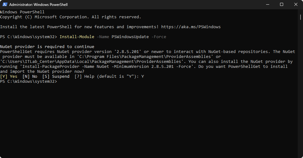 PS C:\Windows\system32> Install-Module -Name PSWindowsUpdate -Force
