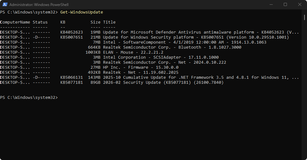 Run the following command from the Administrator PowerShell to see a list of all of the available updates