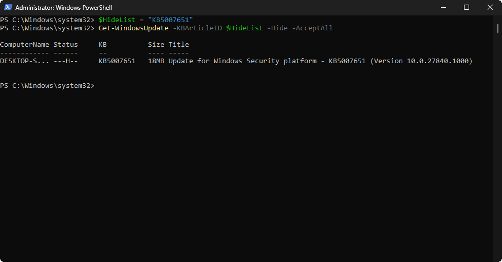 PS C:\Windows\system32> Get-WindowsUpdate -KBArticleID $HideList -Hide -AcceptAll
