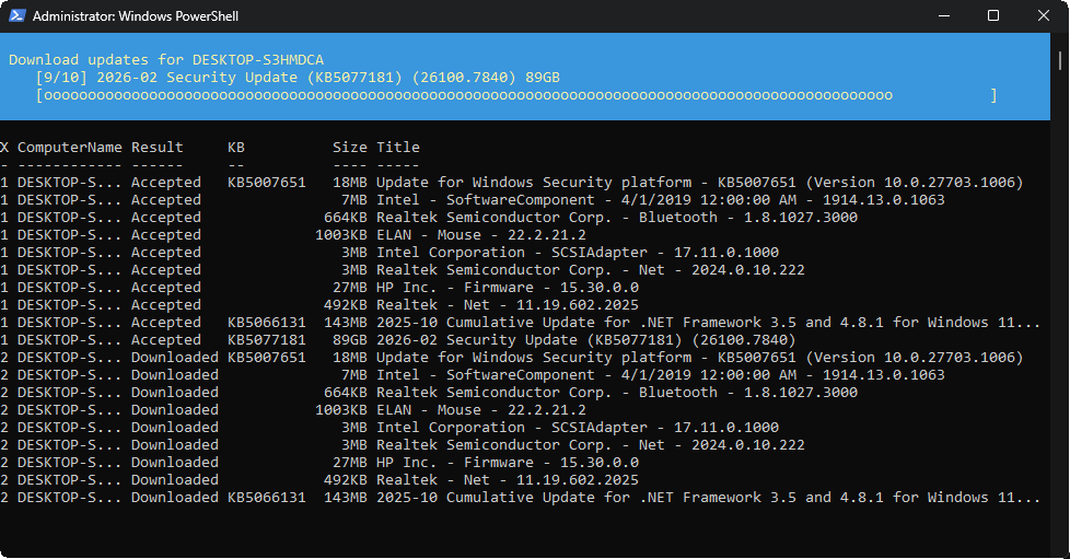 Run the following command from the Administrator PowerShell to apply all of the available windows updates
