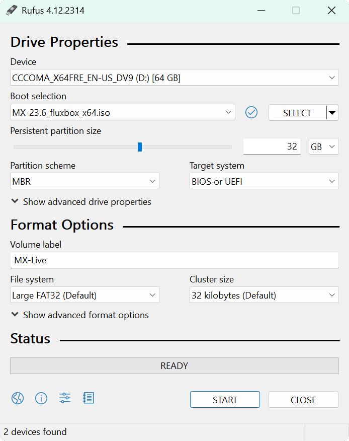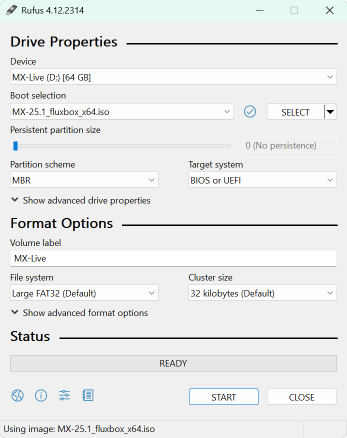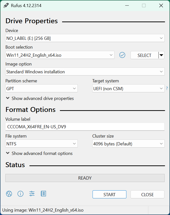 Insert USB Flash Drive, run rufus.exe, select target drive, select Windows Server 2025 ISO, hit start: