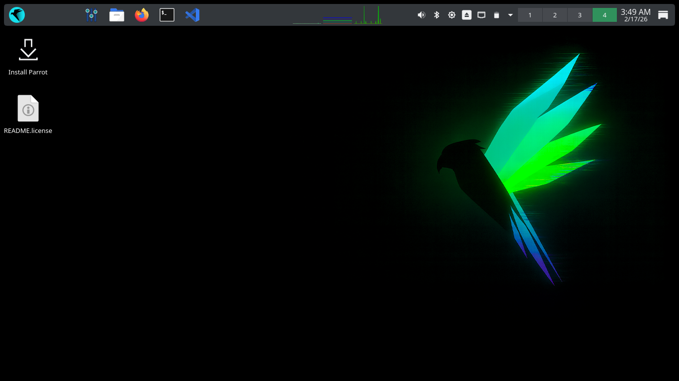 Once our live operating system boots, you will be taken to the dektop environment for Parrot Security OS