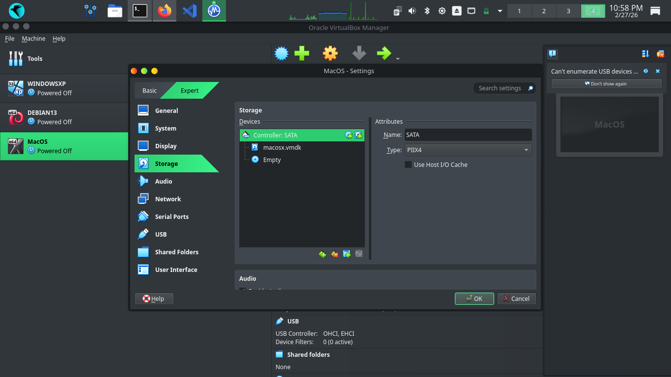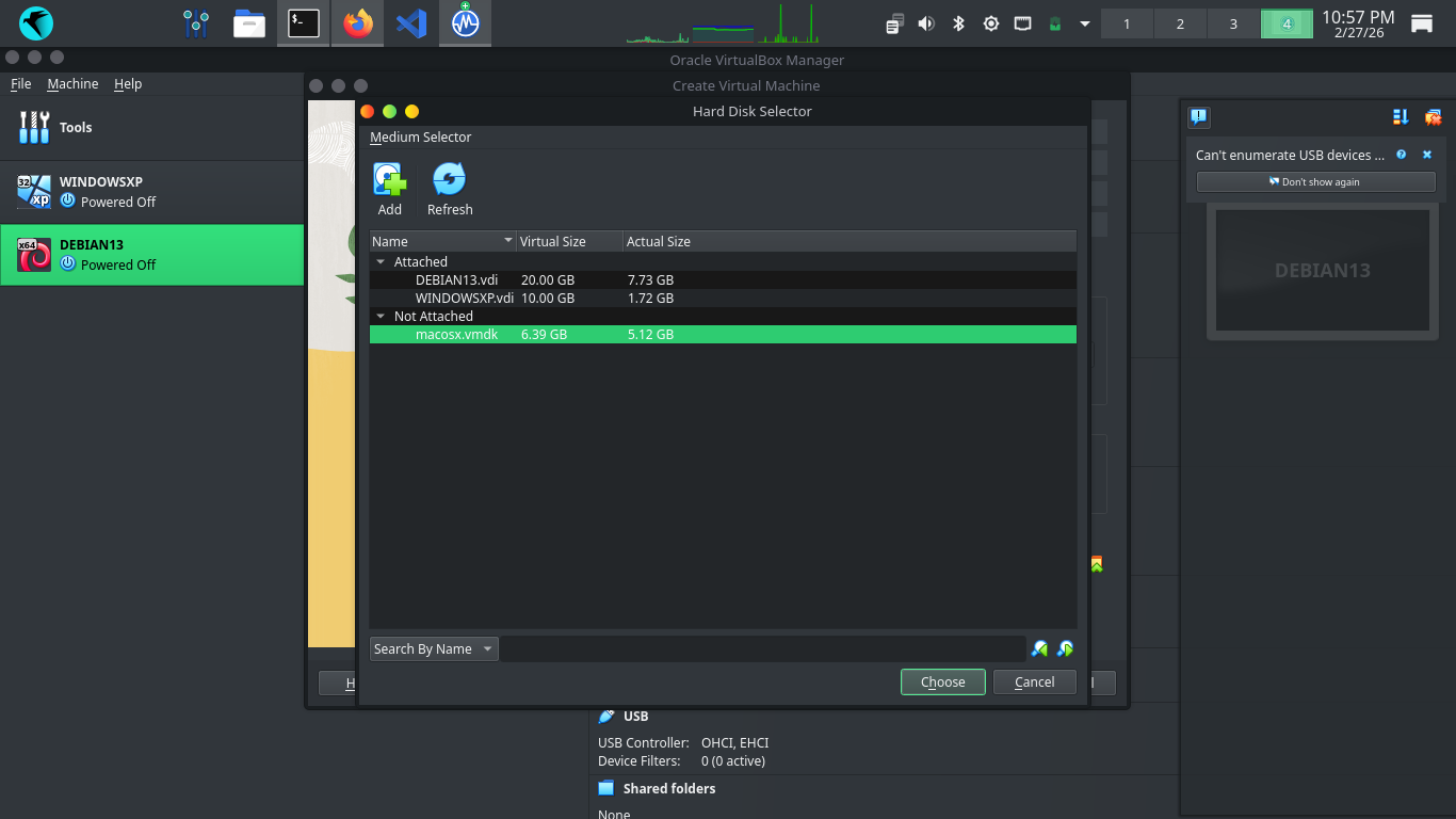 Next head to Hard Disk > Use an Existing Virtual Hard Disk File > Add > .VDMK and select our macosx.vdmk
