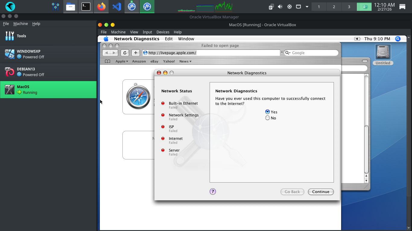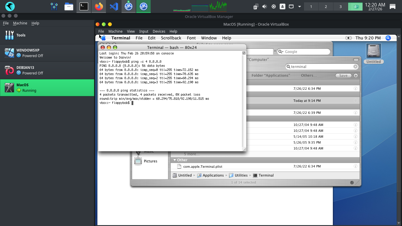 Run the following command from the MacOSX Terminal to test the MacOS virtual machines network connectivity