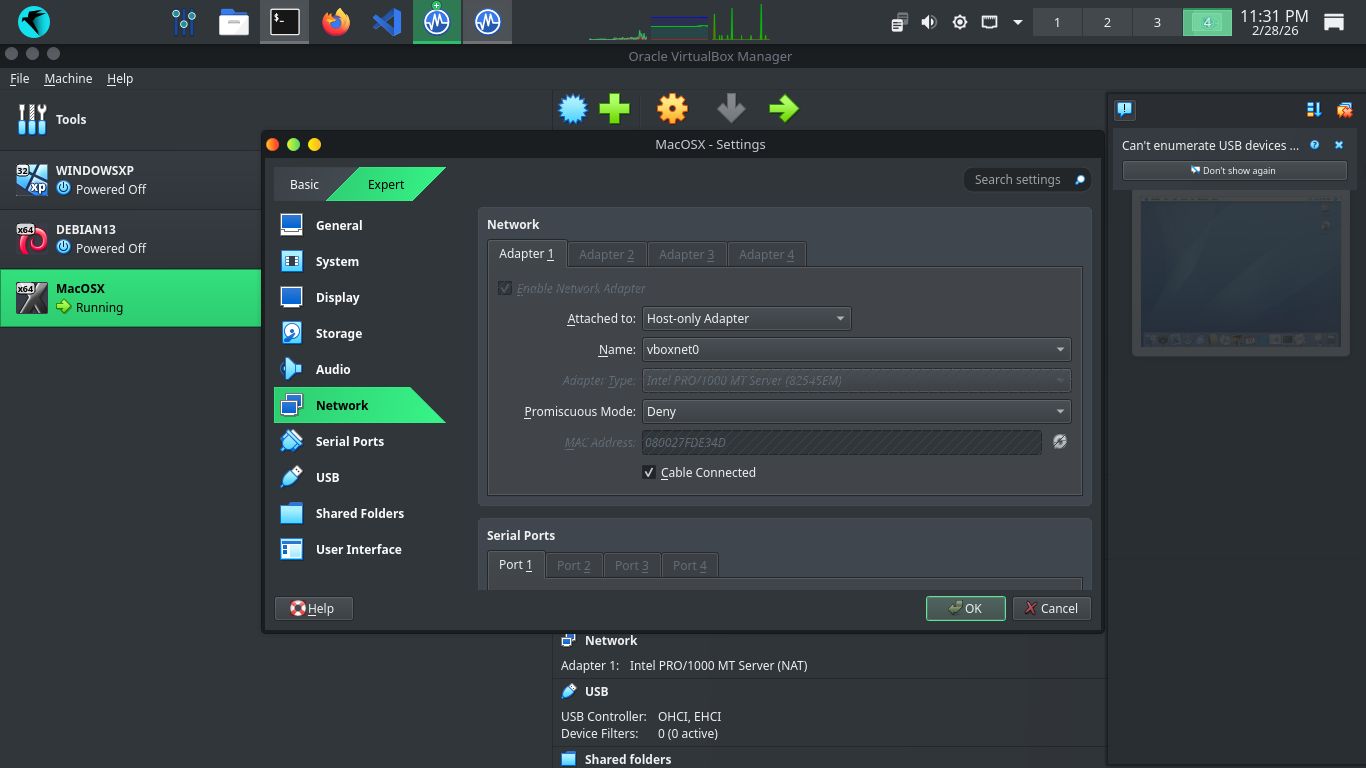 From Virtualbox click MacOS on the left, then settings > network settings and attach to Host-Only Network