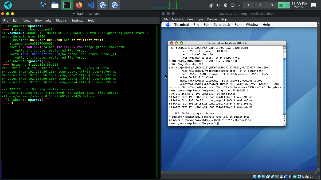 Run the following commands from the Parrot and MacOS Terminals to ping each other to test our connectivity