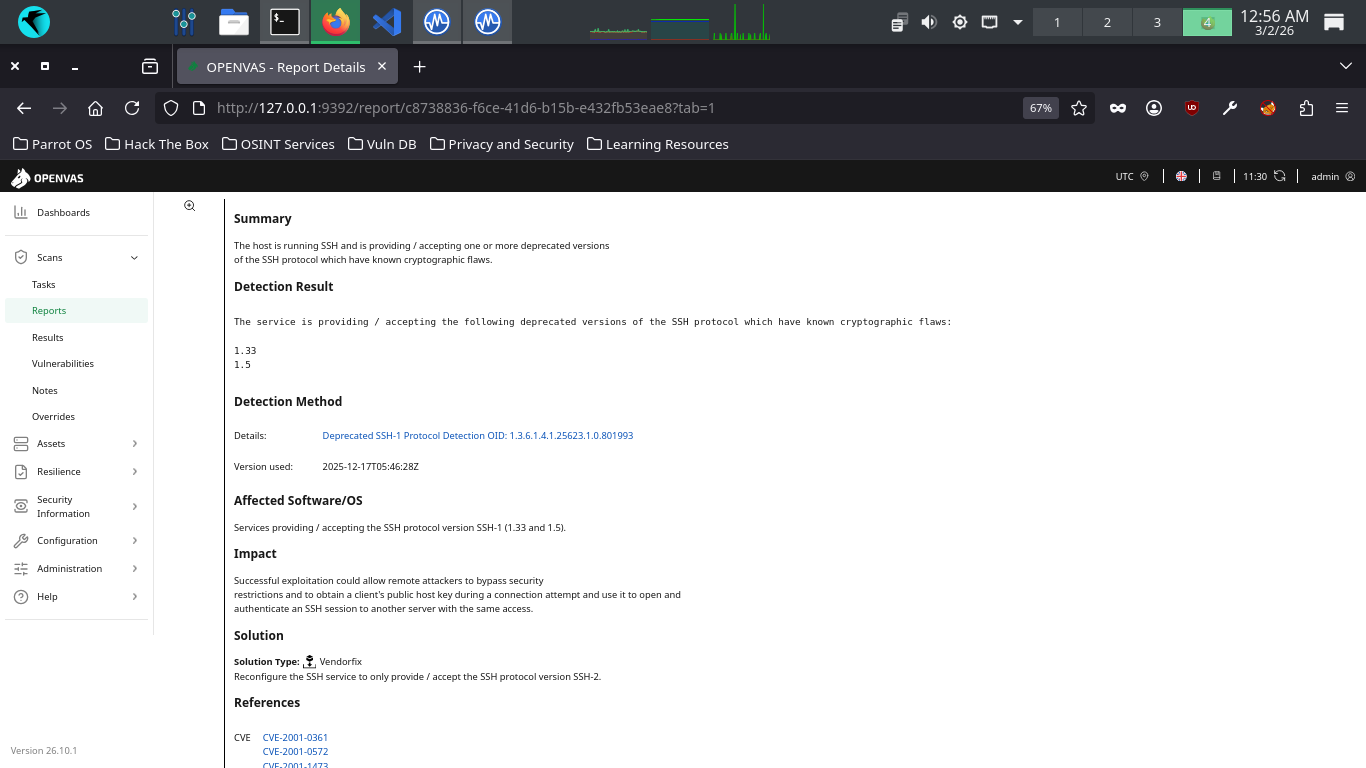 The SSH versions 1.33 and 1.5 were found by OpenVAS to be supported, which can be cracked with modern tools