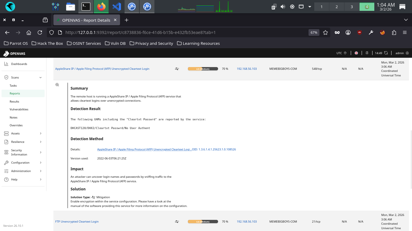 Let's check out one more, navigate back to Scans > Tasks > DebianScan Report > Anonymous FTP Login Report