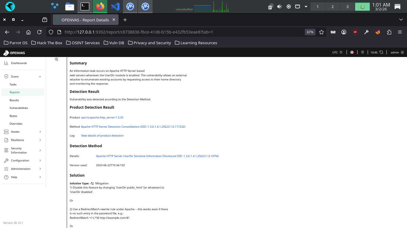 OpenVAS includes any Insights it has about the vulnerability, as well as the potential exploitation impact