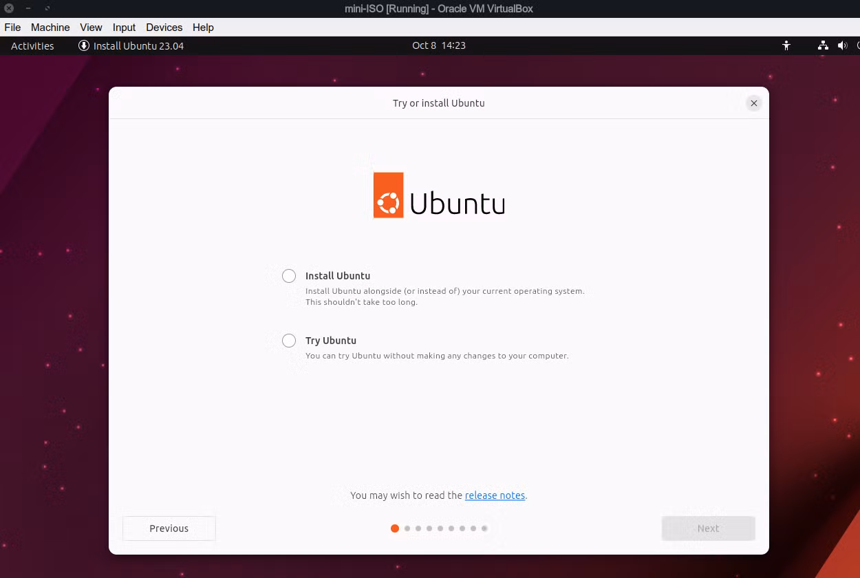 Navigate through the language and keyboard layout options until you reach the 'Try Ubuntu' option: