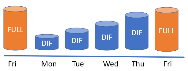 In the example above, admins take a full backup on Friday, then differentials Monday through Thursday