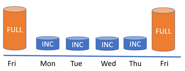 In this example above, admins again create a full backup Friday, then incremental backups Mon-Thurs