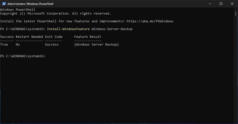 PS C:\WINDOWS\system32> Install-WindowsFeature Windows-Server-Backup