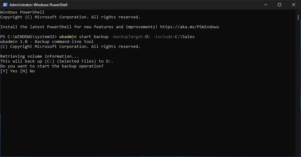 PS C:\WINDOWS\system32> wbadmin start backup -backupTarget:D: -include:C:\Sales