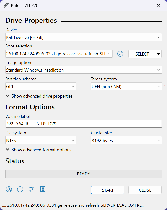 Insert USB Flash Drive, run rufus.exe, select target drive, select Windows Server 2025 ISO, hit start: