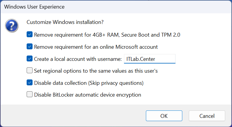 Use the rufus popup menu to customize the Windows Server 2025 installation and disable data collection: