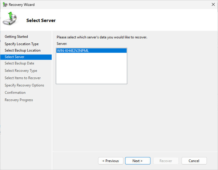 From the Select Server page, select the WIN Server, then click Next to continue with the recovery: