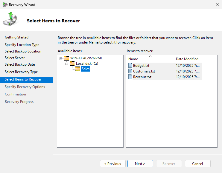 From the Select Items to Recover page, navigate to the C:\Sales folder and select it, then hit Next: