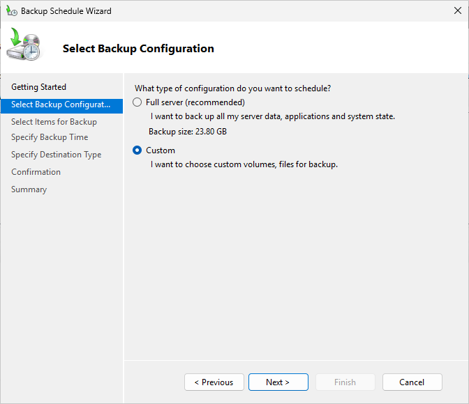 Click Next, then on the Select Backup Configuration Page, select the Custom radio button like below: