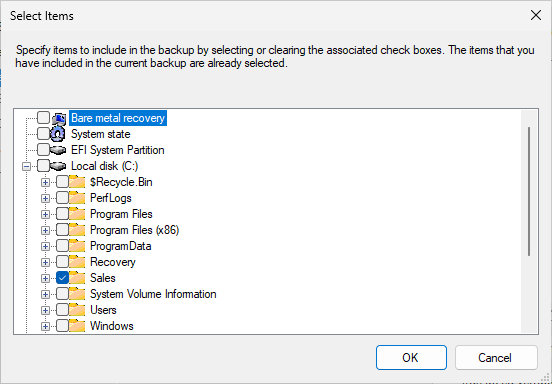 In the Select Items dialog window, expand Local Disk (C:) and click the checkbox for the Sales folder