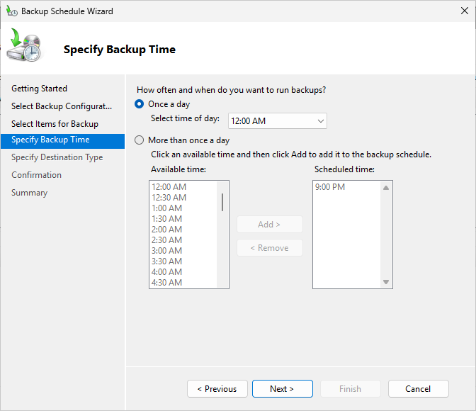 Click Next to continue, then from the Specify Backup Time page, change the Time of Day to 12:00AM:
