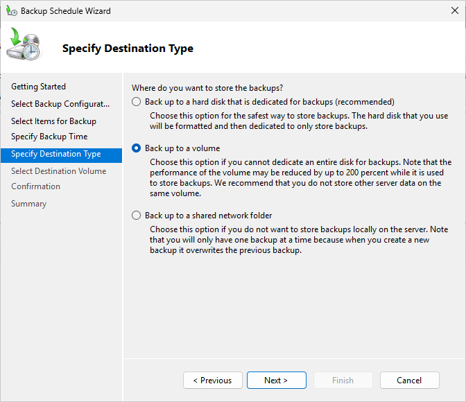 On the Specify Destination Type page, select the Back up to a volume radio button and then click next: