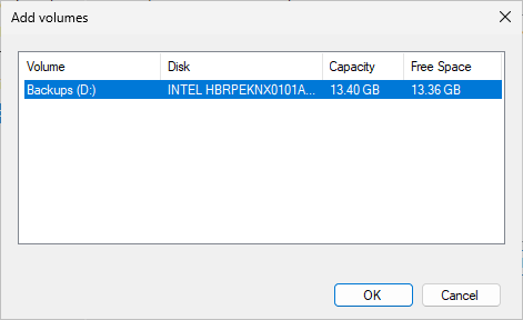 On the Select a Destination Volume page, click Add to open the Add Volumes box, select Backups (D:):