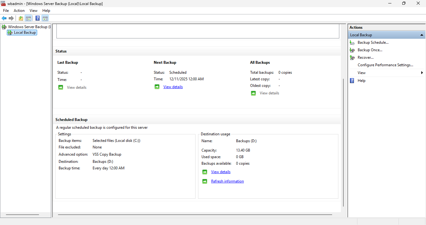 In the wbadmin console, you should see that there is now a scheduled backup in the Status section: