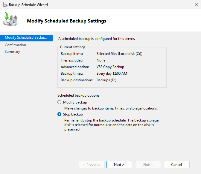 You can use this wizard to change your scheduled backup or stop your backup from running as scheduled