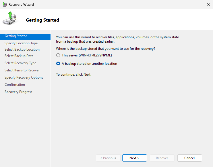 Now head back to the wbadmin console and click Recover... this will reopen the Recovery Wizard window