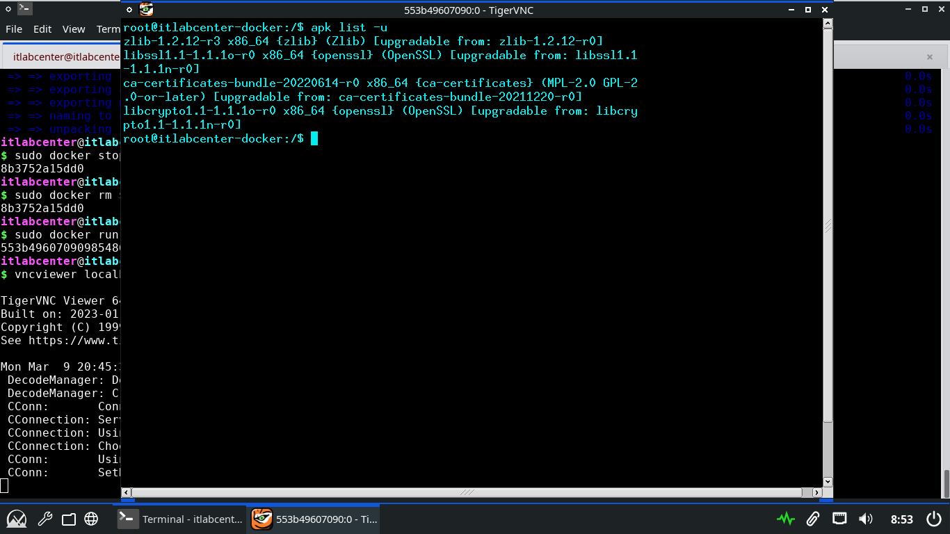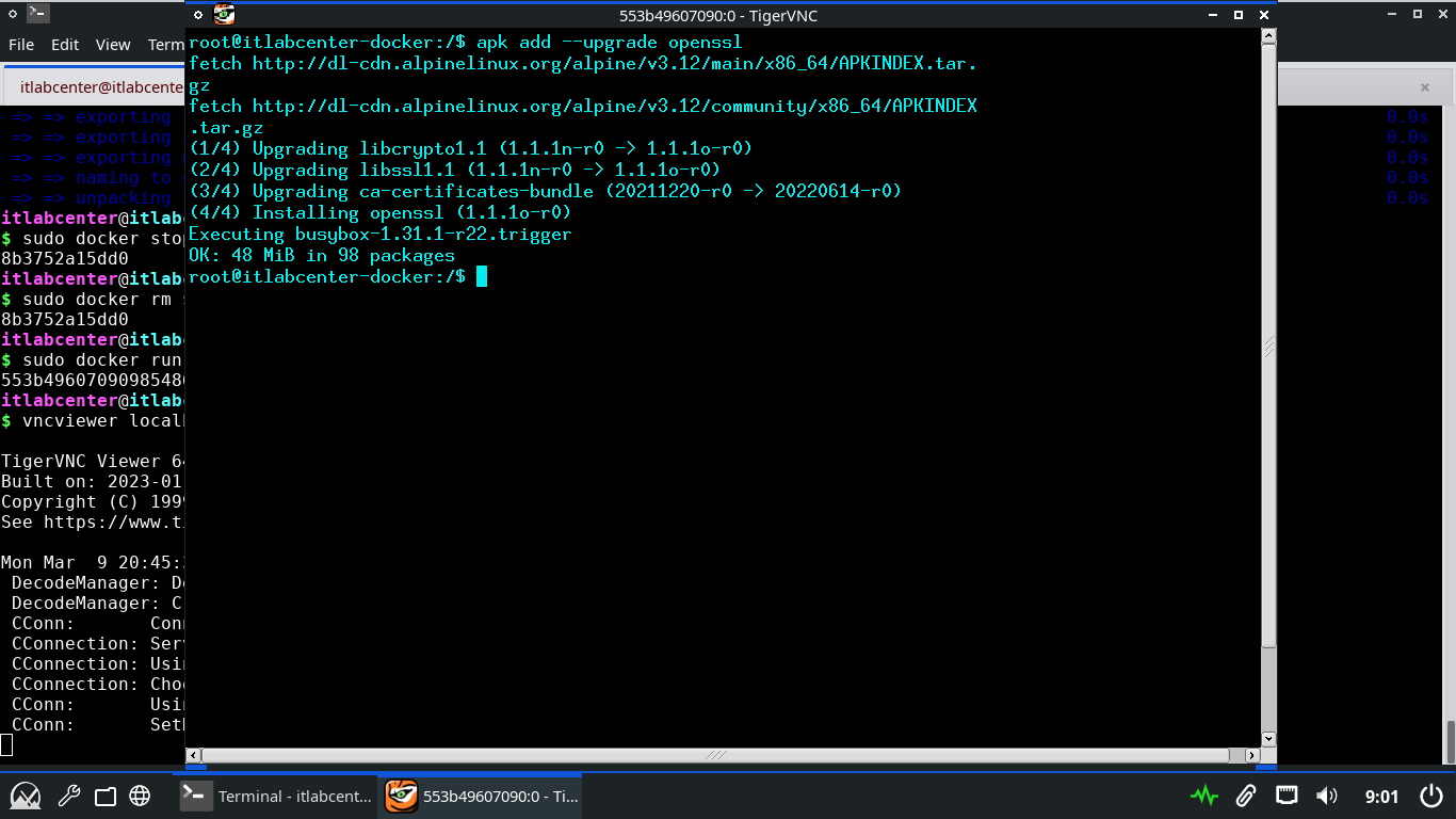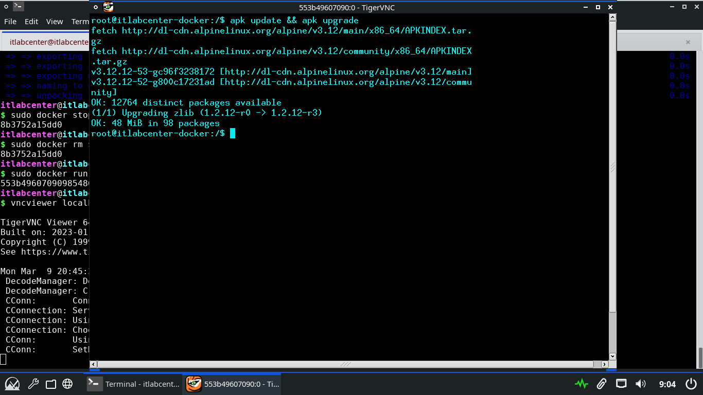 $ sudo docker run -d -p 5900:5900 --name alpine-secure 192.168.0.220/alpine-secure:v1