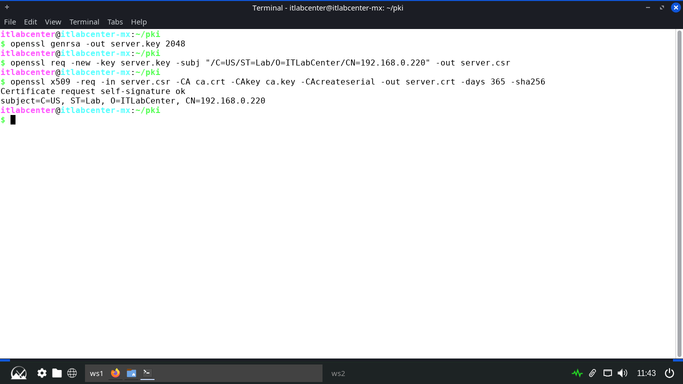 $ openssl req -new -key server.key -subj "/C=US/ST=Lab/O=ITLabCenter/CN=SERVERIP" -out server.csr