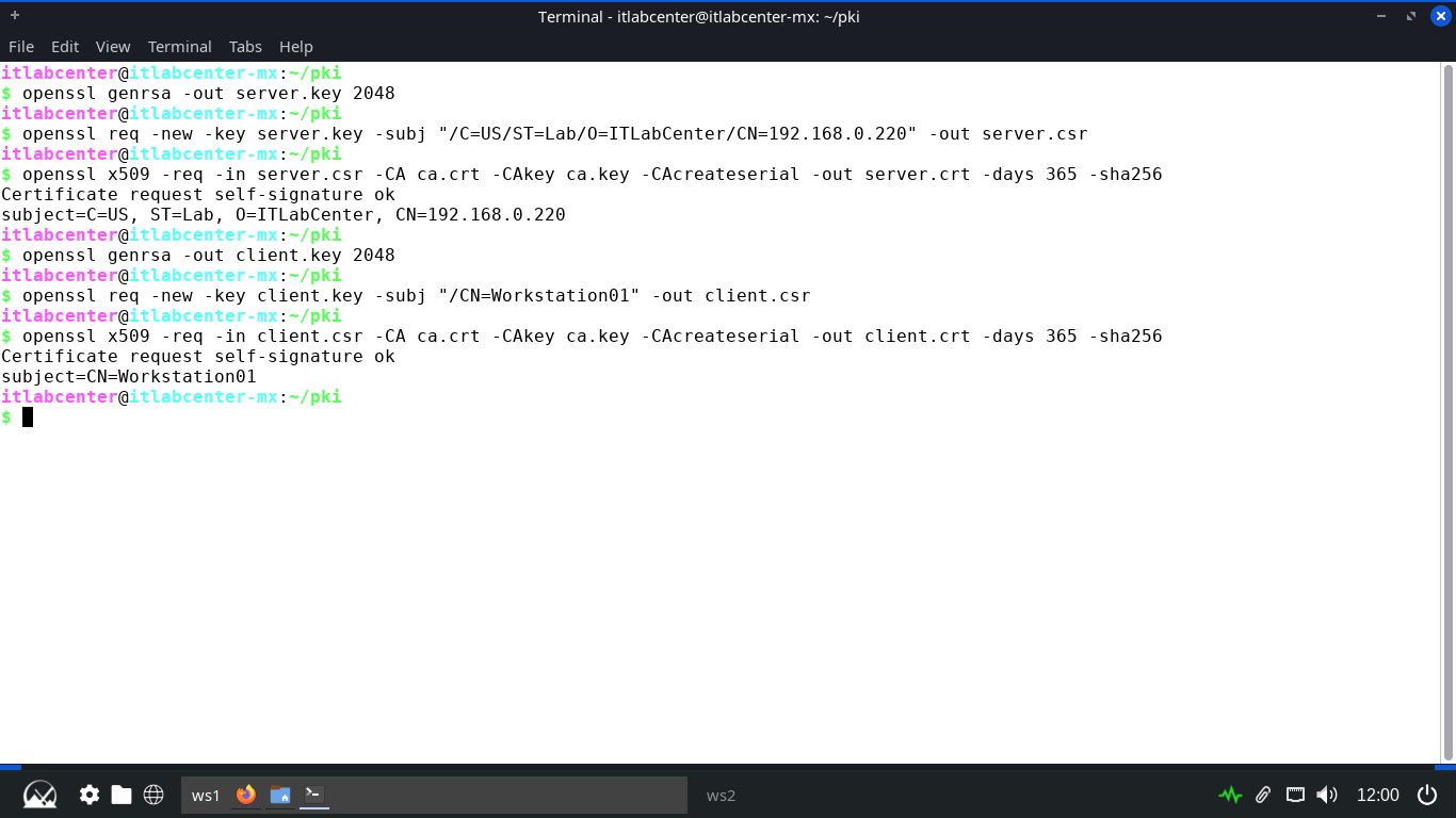 $ openssl req -x509 -new -nodes -key ca.key -sha256 -days 365 -subj "/C=US/ST=Lab/L=Lab/O=ITLabCenter/CN=ITLab-CA" -out ca.crt