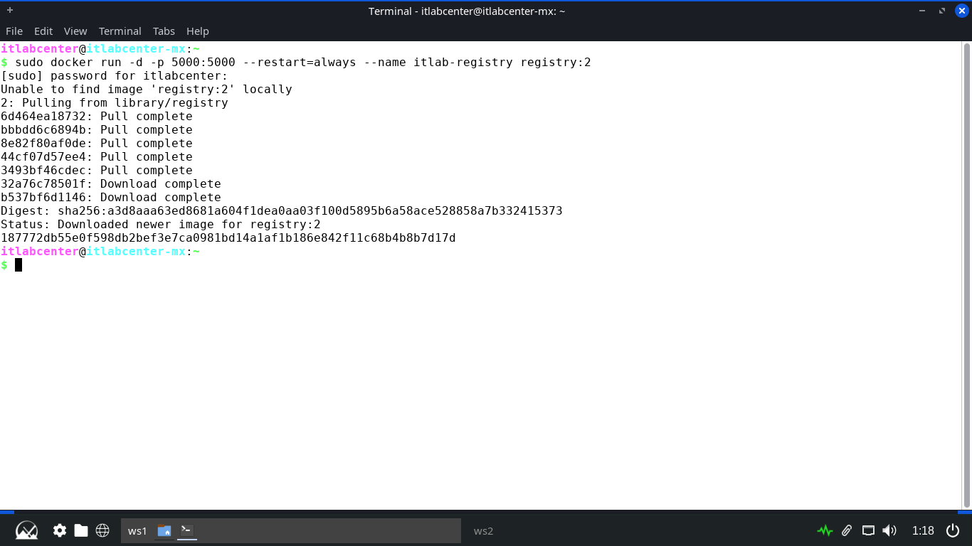 $ sudo docker run -d -p 5000:5000 --restart=always --name itlab-registry registry:2