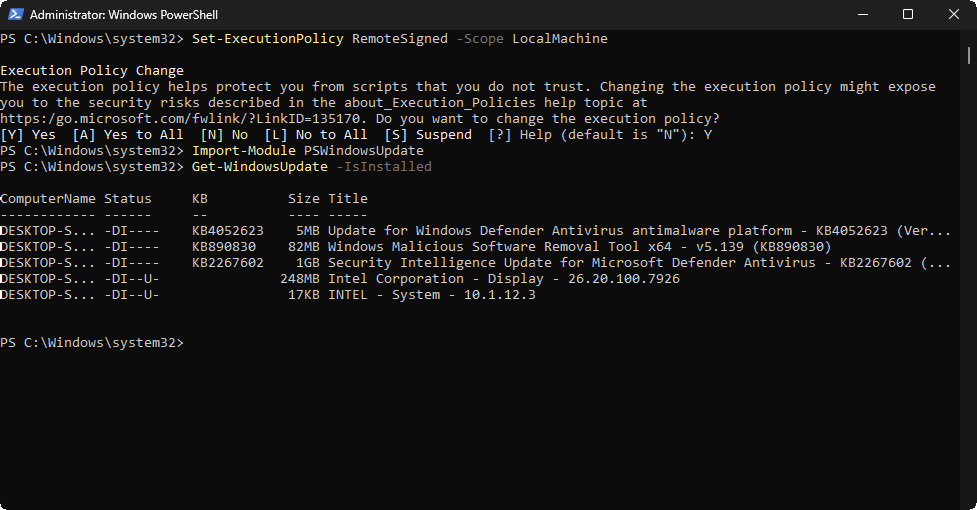 PS C:\Windows\system32> Install-Module -Name PSWindowsUpdate -Force