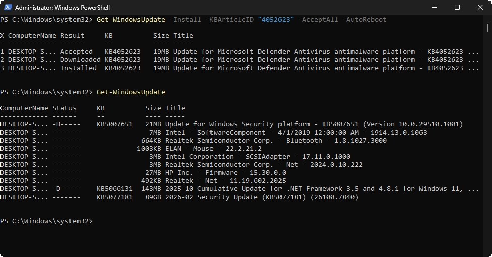 PS C:\Windows\system32> Get-WindowsUpdate -Install -KBArticleID "4052623" -AcceptAll -AutoReboot