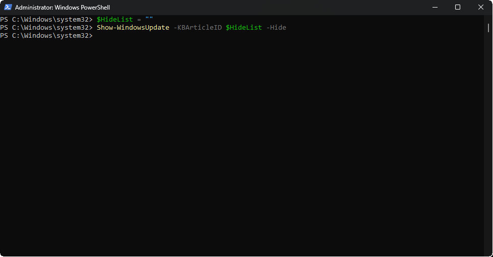 PS C:\Windows\system32> Get-WindowsUpdate -KBArticleID $HideList -Hide -AcceptAll
