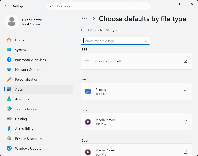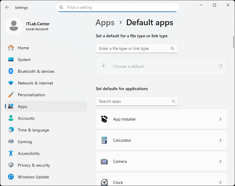 On the Default Apps pages, scroll down to select the "Choose default apps by file" menu option: