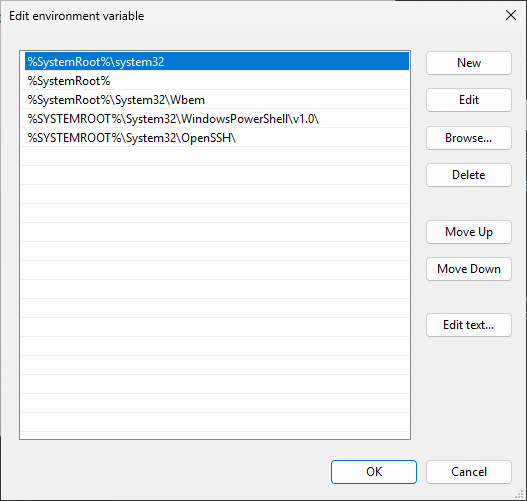 Under System Variables, scroll down and select Path, then click edit to open the editing window: