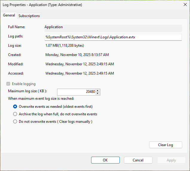 In the Event Viewer, right-click the Application log and select properties to open the properties: