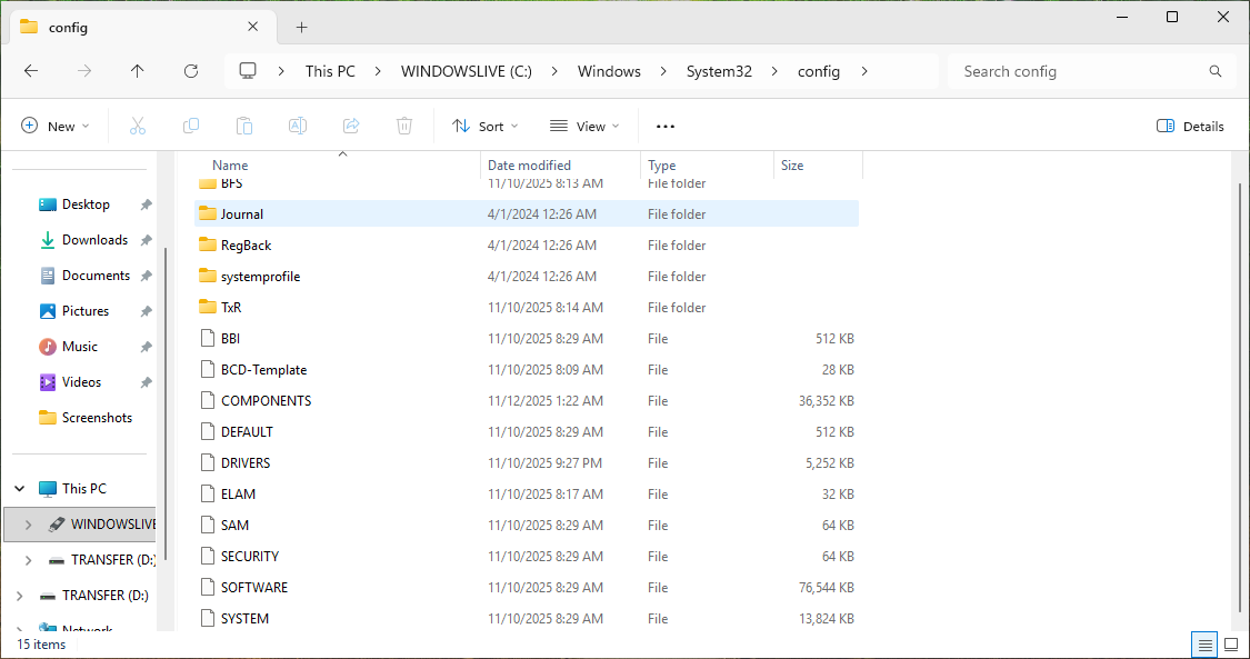 Using the File Explorer, navigate to C:\Windows\Systems32\config and click continue when prompted: