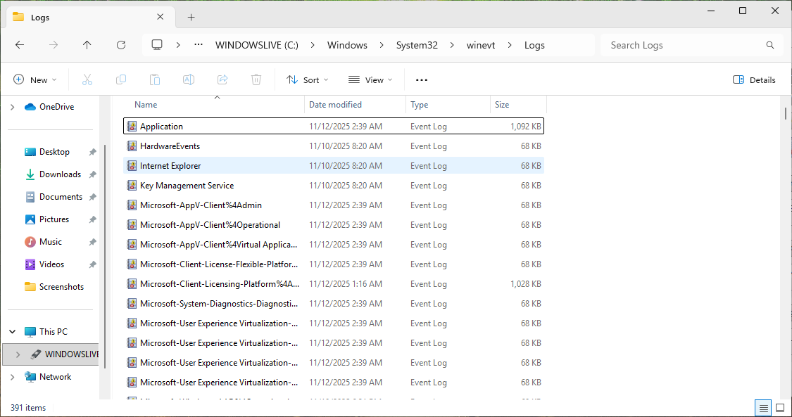 Take note of all the .evtx files which are primary windows logs, only readable with Event Viewer