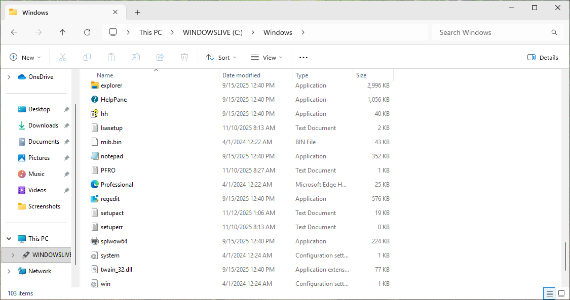 Navigate up one directory (C:\Windows). Here we find the Registry Editor, File Explorer and Notepad
