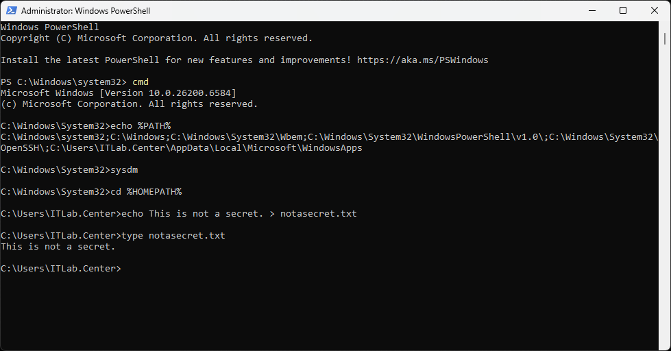 C:\Users\ITLab.Center>echo This is not a secret. > notasecret.txt