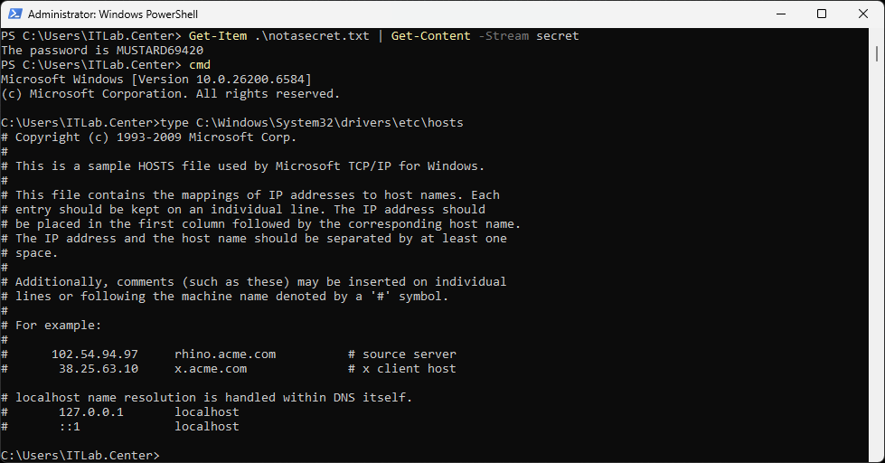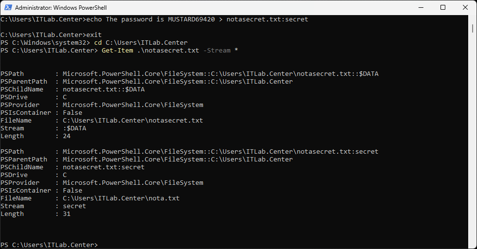 C:\Users\ITLab.Center>echo The password is MUSTARD69420 > notasecret.txt:secret