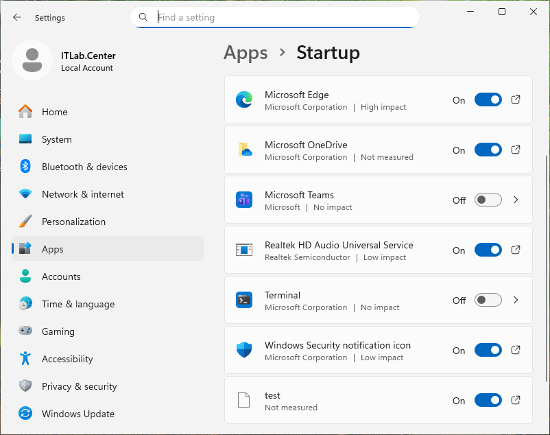 This means that Windows will try to run test.bat every time the user account ITLab.Center logs in