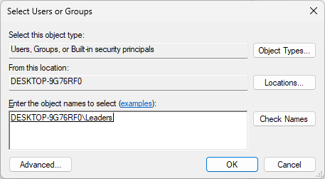 In the Select Users or Groups window, type Leaders into the Enter the object names to select field