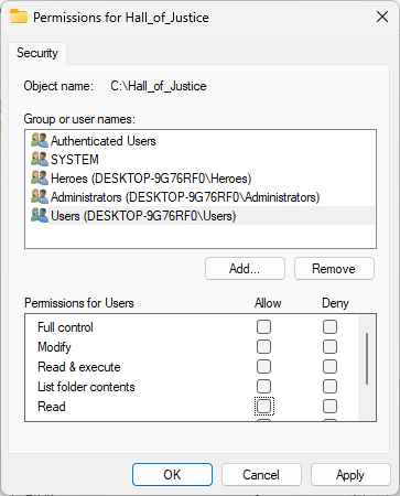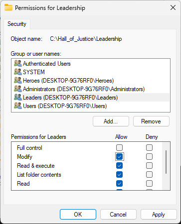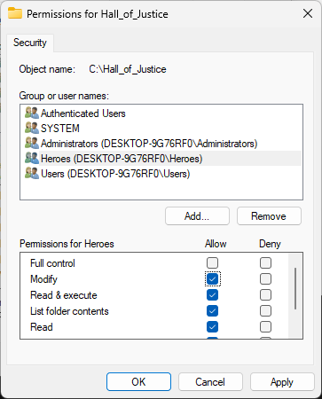 We want members of the Heroes group to have modification permissions for the Hall_of_Justice folder