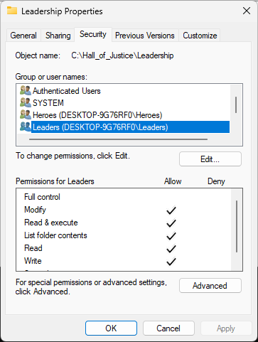Head back to the Leadership folders Properties Window and the Security tab, then click on Advanced: