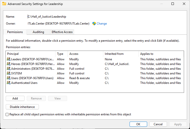 Notice that members of the Heroes Group have Modify (M) access to Hall_of Justice folder and children